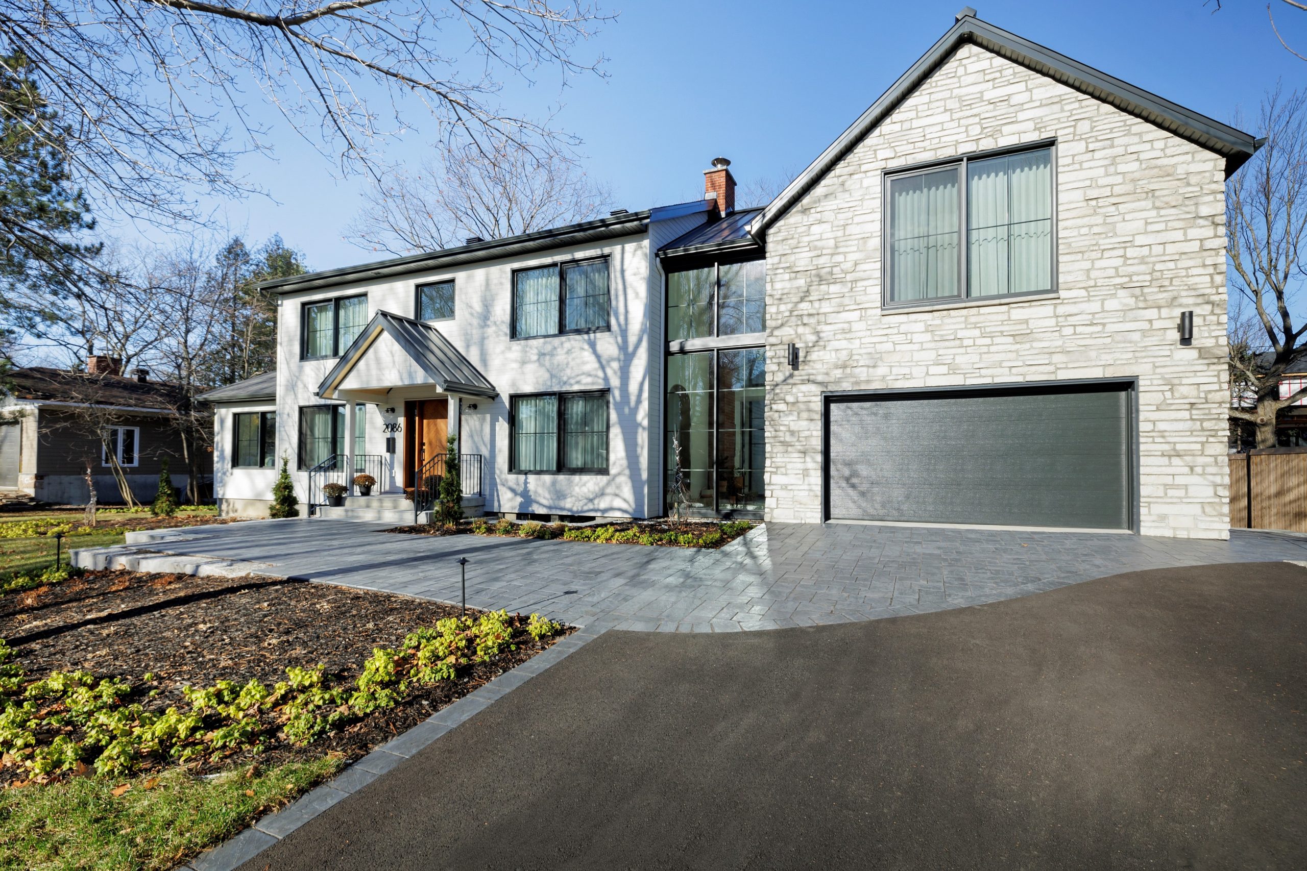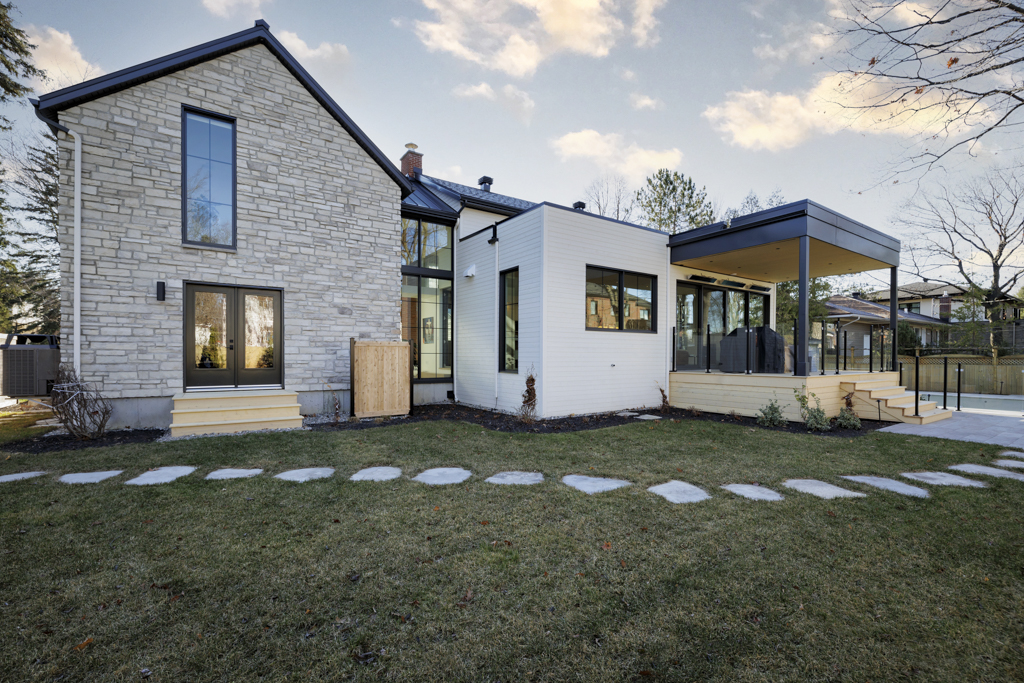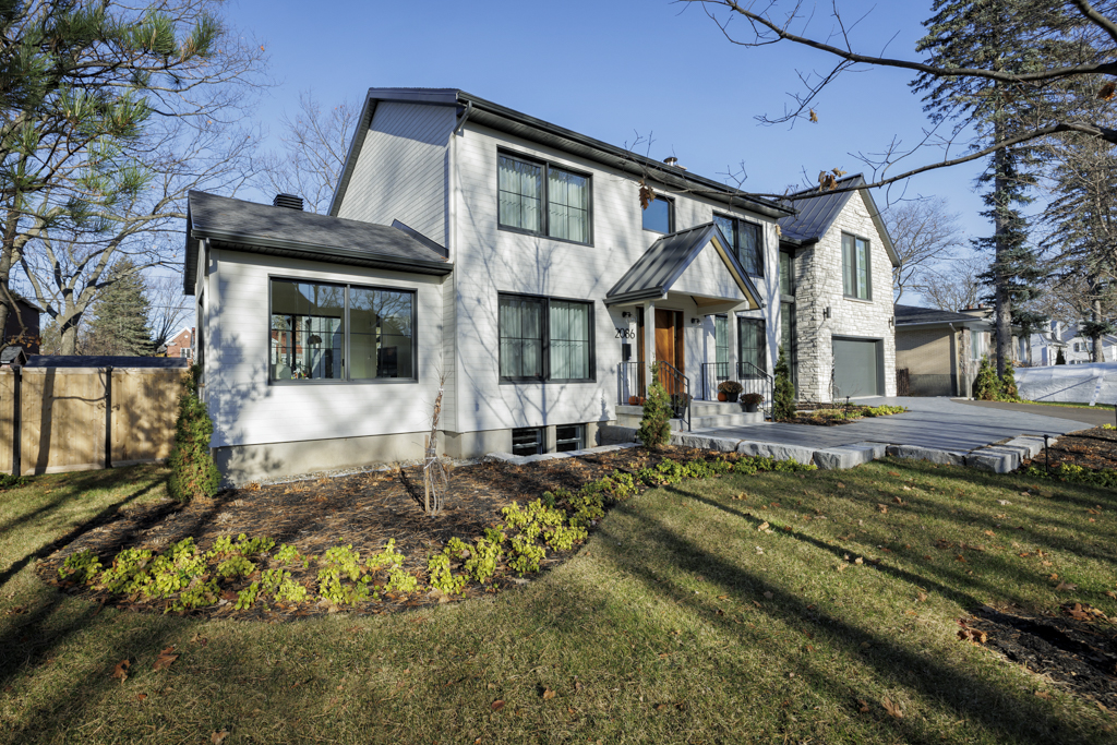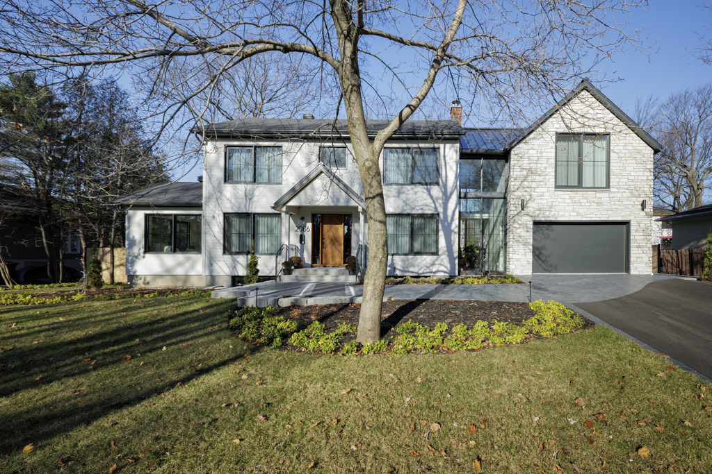 La structure d’origine a été conservée afin de respecter l’esprit du bâtiment, tandis que le garage attenant a été remplacé par un agrandissement comprenant un garage double, apportant une nouvelle présence à la résidence. Un second agrandissement, à l’arrière, muni d’une généreuse fenestration, vient compléter l’ensemble en favorisant la lumière naturelle et l’ouverture sur la cour.