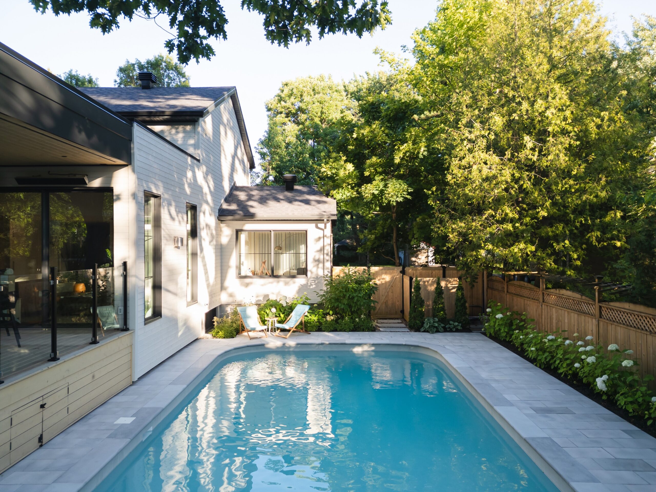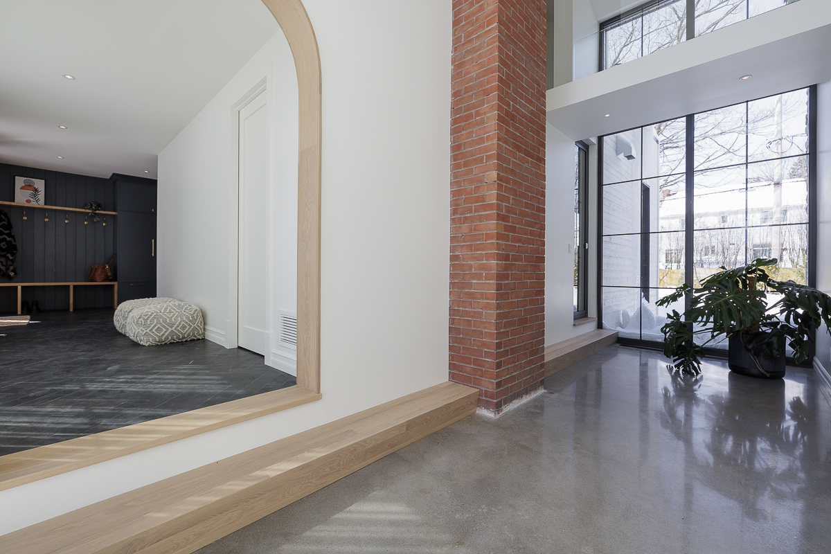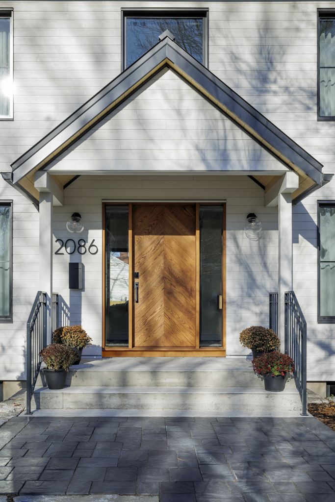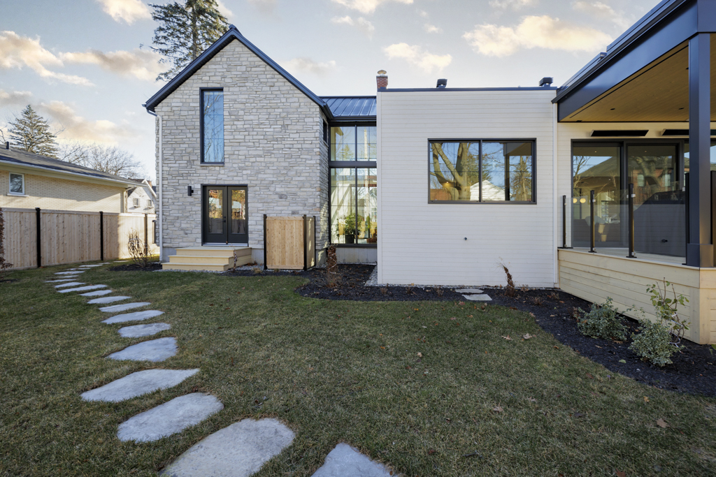 La structure d’origine a été conservée afin de respecter l’esprit du bâtiment, tandis que le garage attenant a été remplacé par un agrandissement comprenant un garage double, apportant une nouvelle présence à la résidence. Un second agrandissement, à l’arrière, muni d’une généreuse fenestration, vient compléter l’ensemble en favorisant la lumière naturelle et l’ouverture sur la cour.