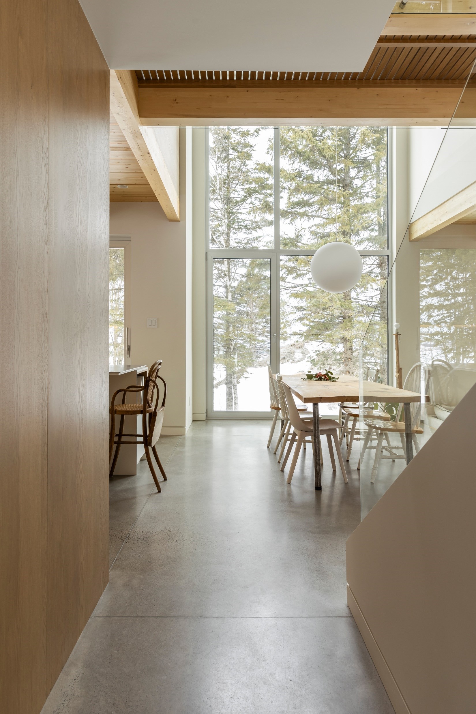 L’esprit de la résidence principale s’inspire des critères de conception d’un chalet, offrant une ambiance calme et un apport parfait d’intimité et de connexion à la nature environnante. La structure de bois lamellé-collé confère une esthétique enveloppante à cette aire de vie et contraste joliment avec les éléments à l’aspect froid du projet, tels que le plancher de béton poli et le majestueux comptoir d’inox.