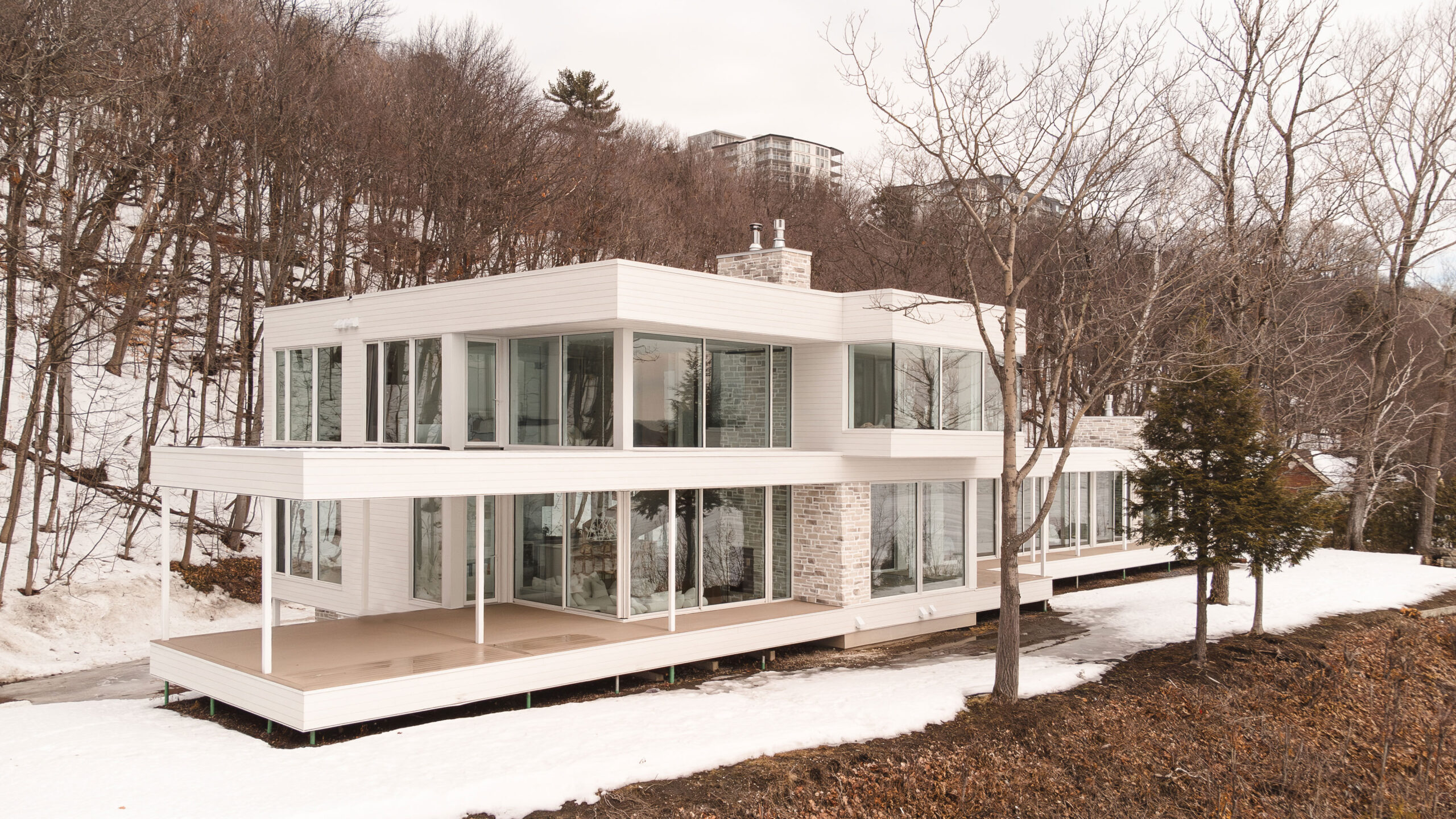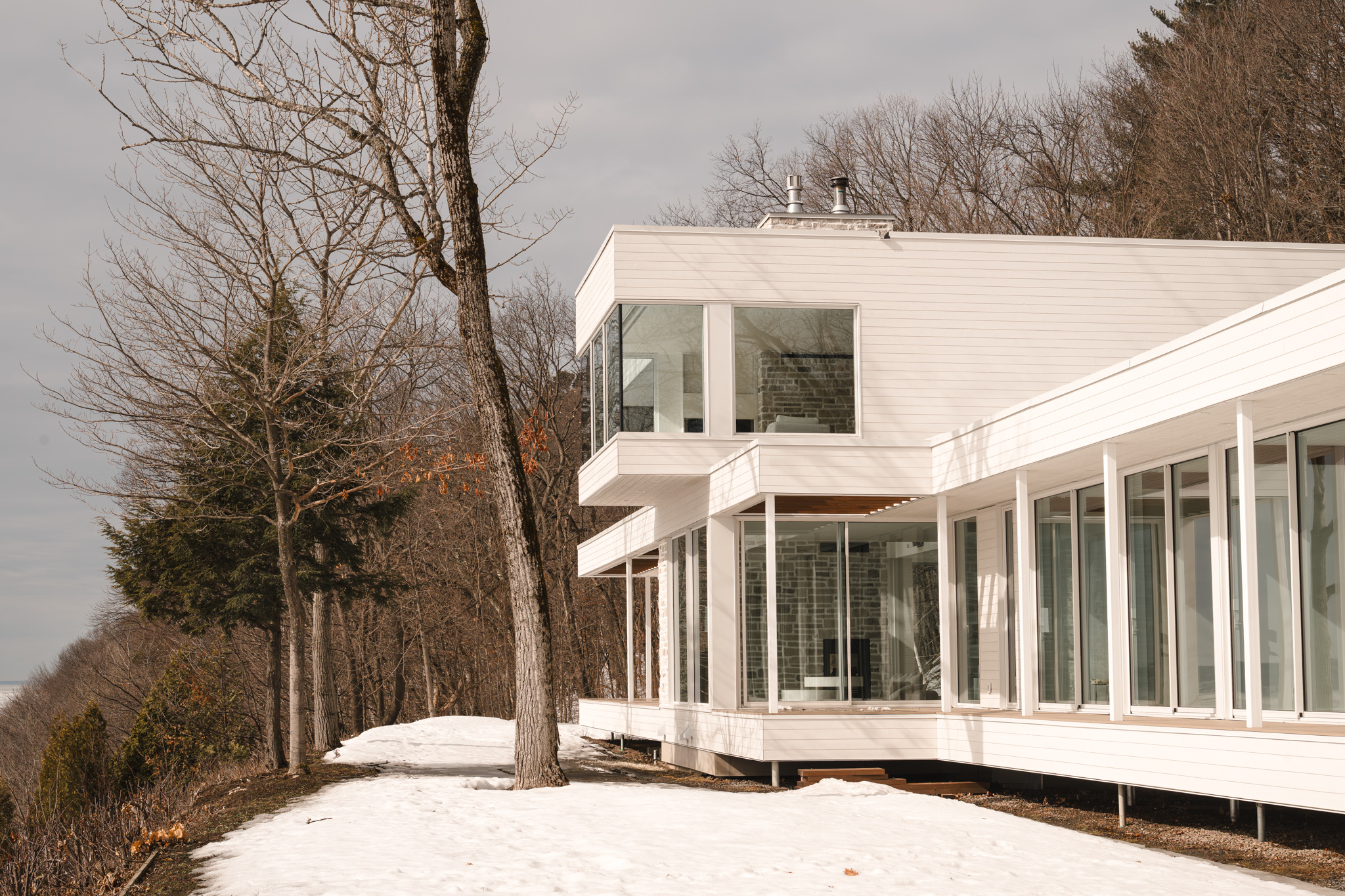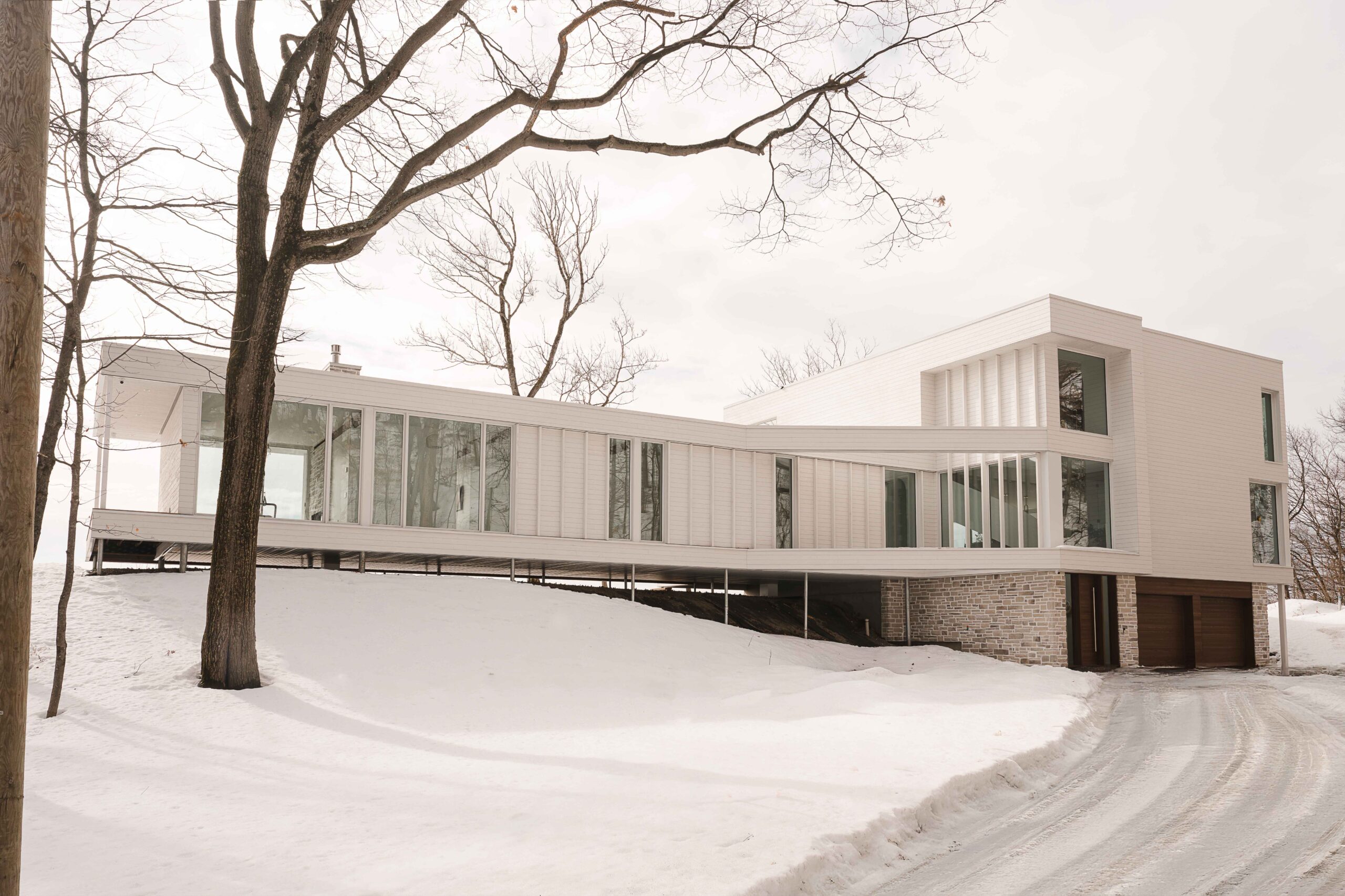 Rénovation majeure d’une résidence en bordure du fleuve à Saint-Augustin-de-Desmaures, issue de la fusion de deux propriétés adjacentes.