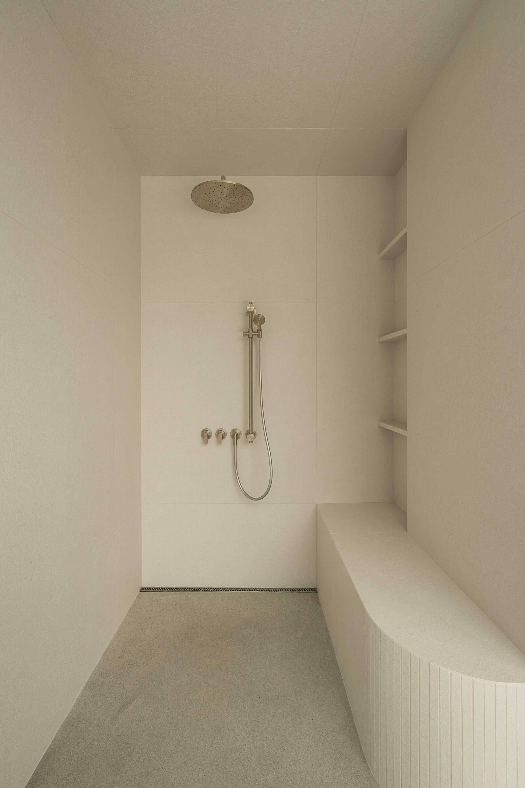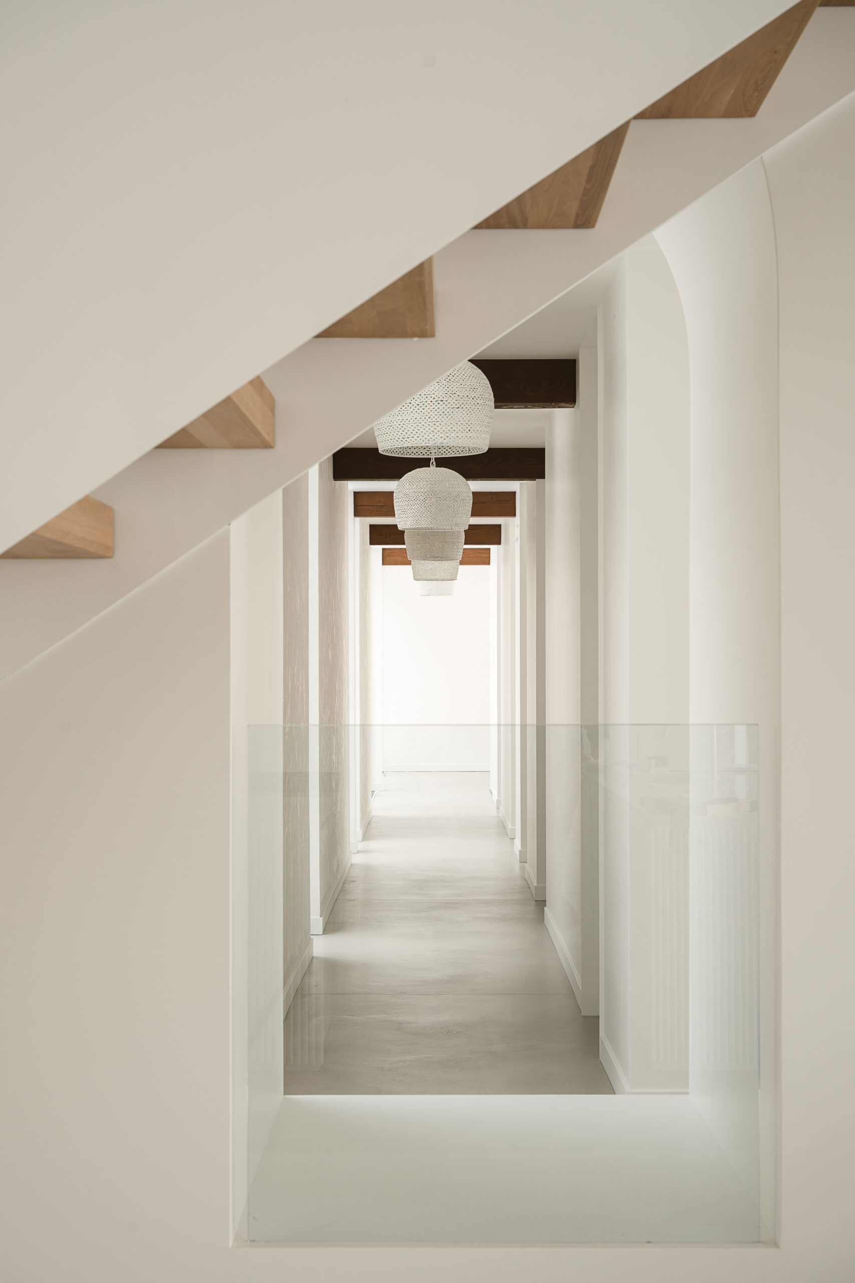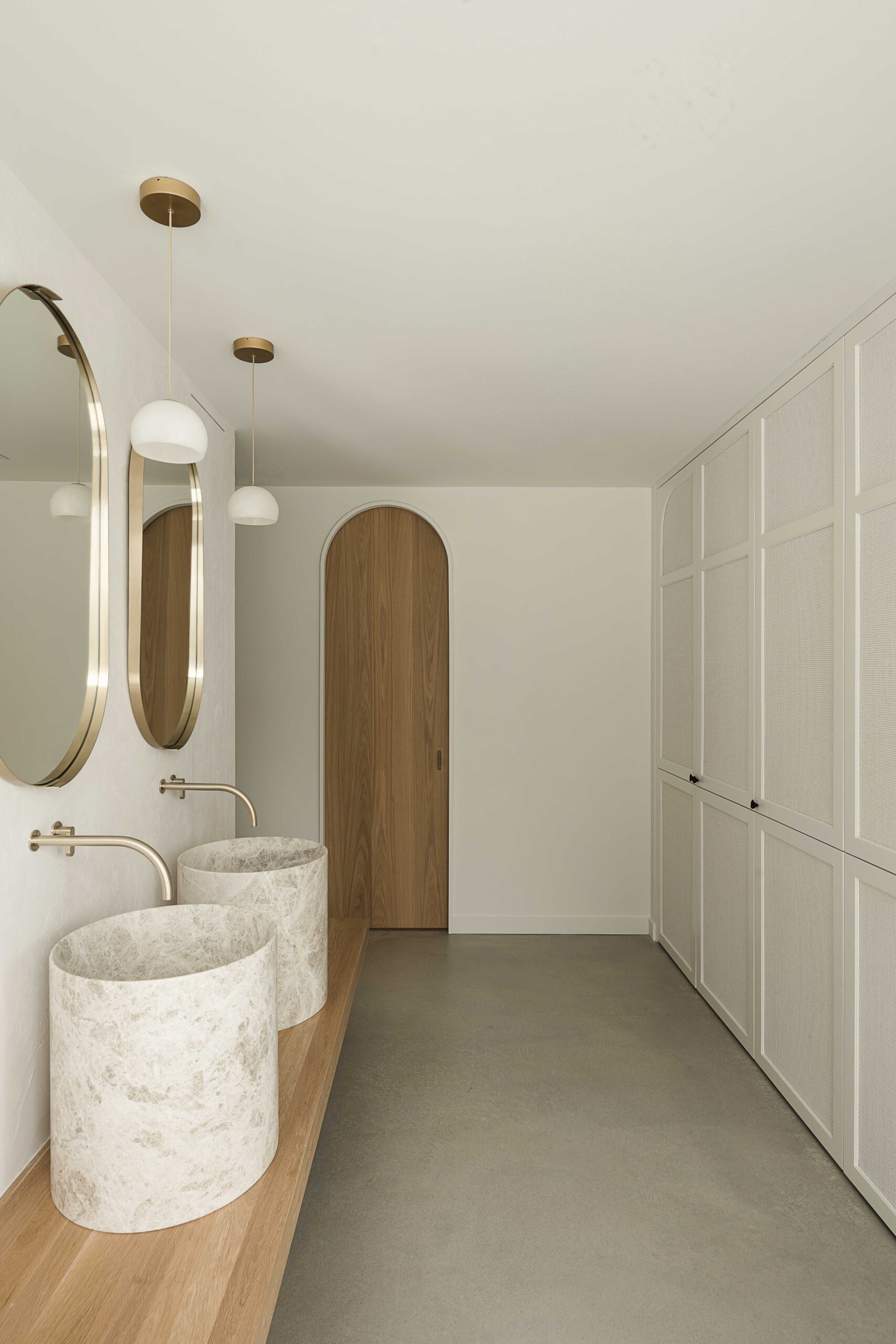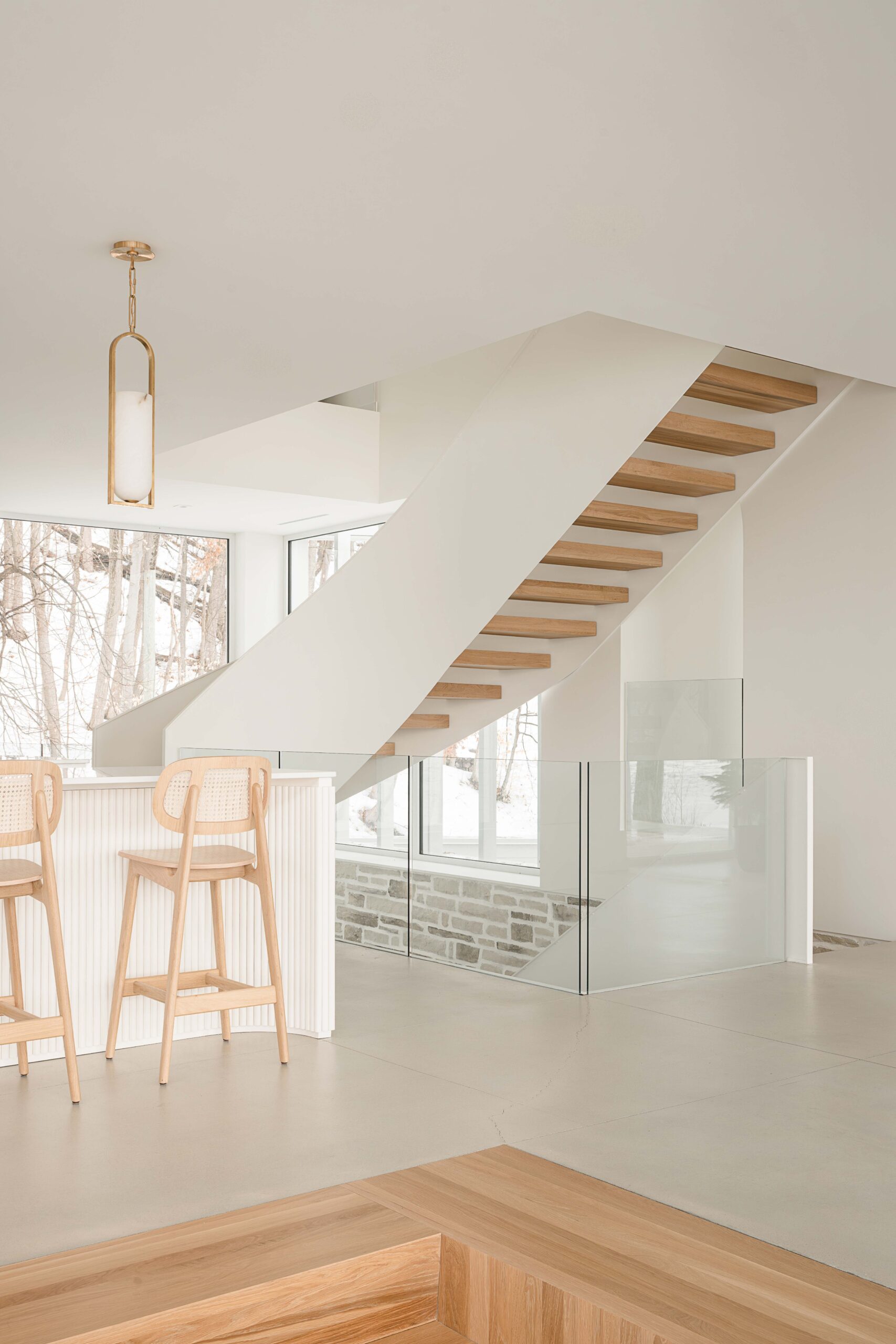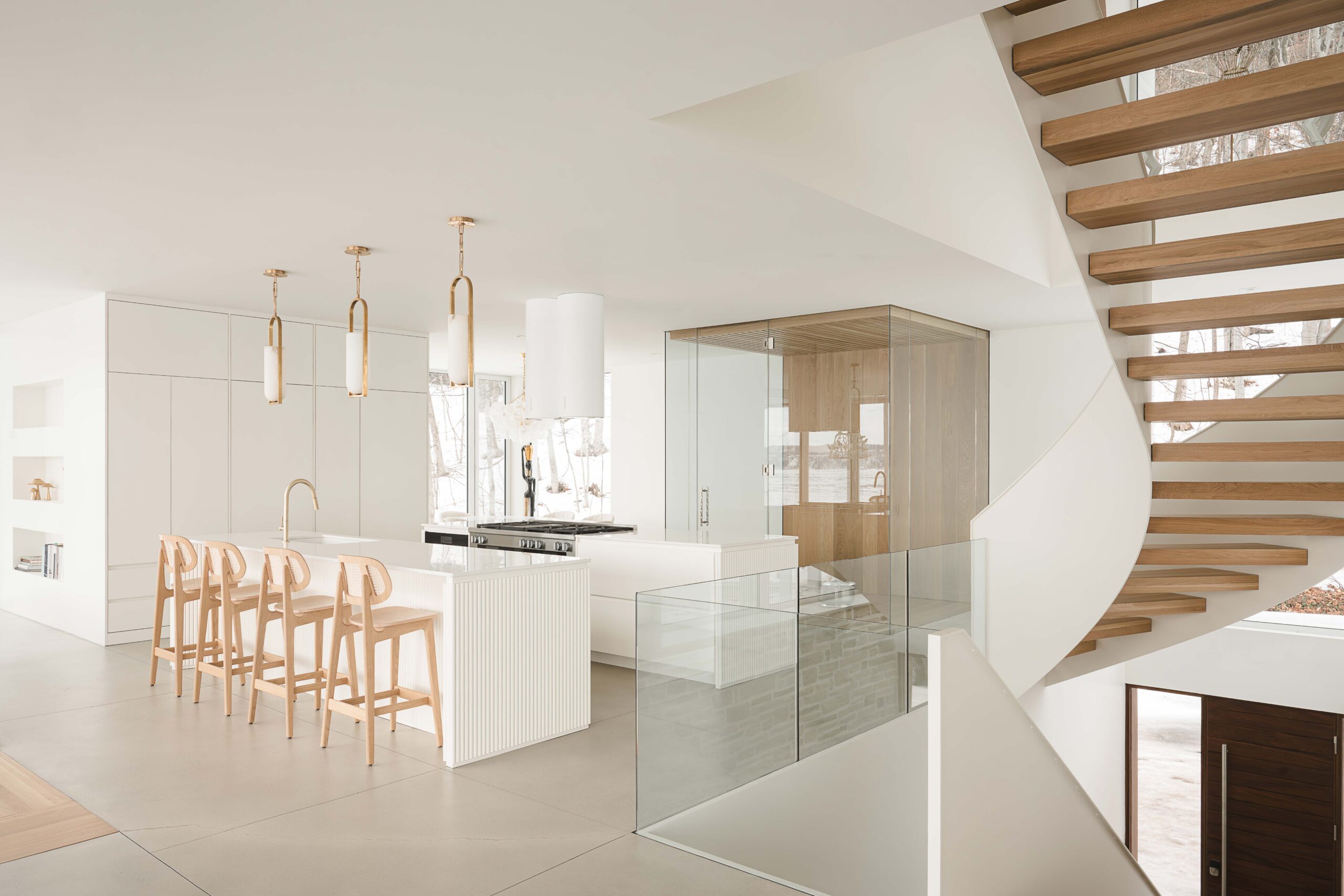 Les choix de matériaux et les détails sur mesure, béton poli, peinture à la chaux, parois vitrées et bois, apportent une richesse subtile à l’ensemble.